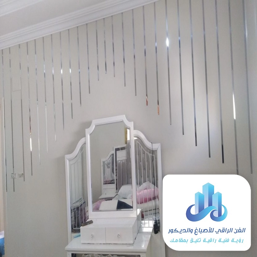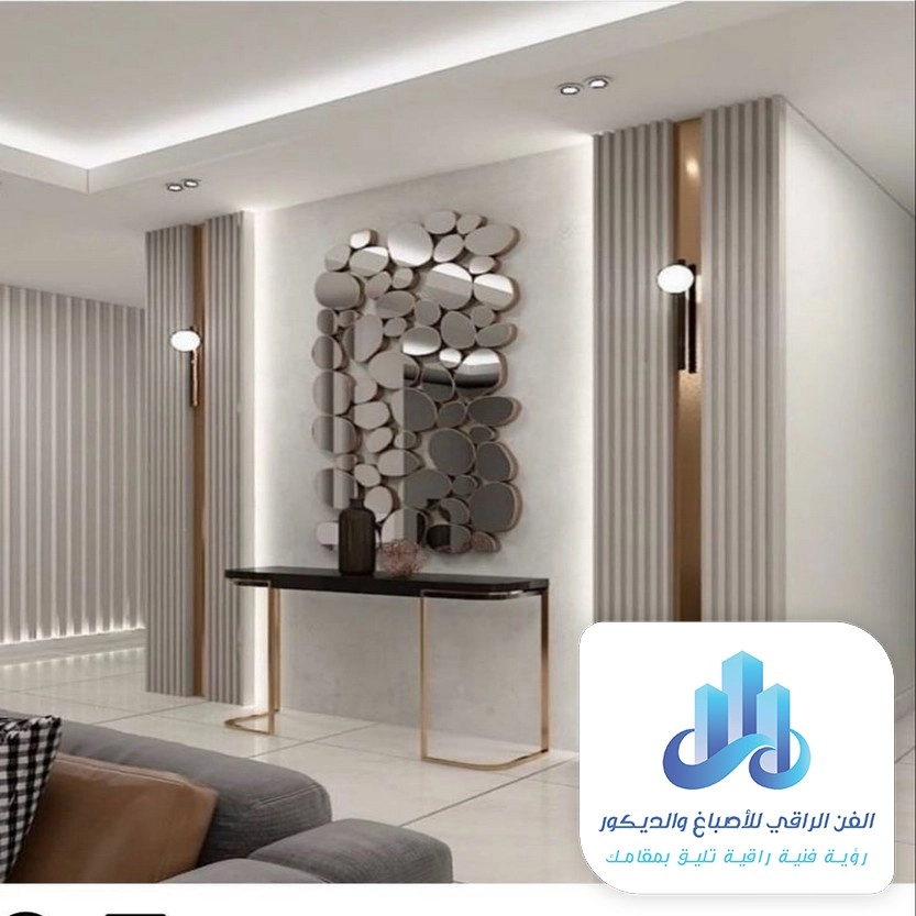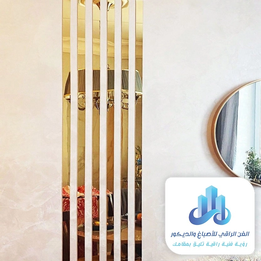 - إطار المرآة: ديكور جدران استيل لامع يحيط بمرآة التزيين يعكس الضوء بهدوء.